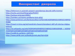 https://lektorium.in.ua/analiz-pasport-opovidannya-darunki-skifiv-kremin/https://osvita.ua/school/biography/91047/https://poltava.to/project/6061/https://tyzhden.ua/chyimy-predkamy-buly-skify/https://www.pinterest.com/berkutovviktor13/%D1%81%D0%BA%D1%96%D1%84%D0%B8/https://travel-in-time.org/uk/mandrivki-chasom/starodavni-skifi-yih-istoriya-religiya-kultura/https://uk.wikipedia.org/wiki/%D0%94%D0%B0%D1%80%D1%96%D0%B9_I_%D0%92%D0%B5%D0%BB%D0%B8%D0%BA%D0%B8%D0%B9https://unalib.ks.ua/dariy-i-skifi.htmhttps://www.ukrlib.com.ua/books/printit.php?tid=4104 Використані джерела