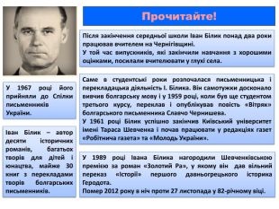 Іван Білик (1930–2012) – український письменник, історичний романіст, перекладач болгарської літератури. Іван Білик народився 17 січня 1929 року в селі Градизьку на Полтавщині. Батько – Іван Вакуленко, після закінчення учительської семінарії працював у школі, а потім став священиком Української автокефальної церкви, настоятелем Троїцького храму в Градизьку. Наприкінці 1928 року його заарештували у справі «Спілки визволення України» і розстріляли за півтора місяця до народження сина. Мати – Ніна Яківна, дала новонародженому хлопчику своє дівоче прізвище – Білик. Цим вона захистила його від клейма «син ворога народу». Допомагала виховувати малого Івасика бабуся по матері Оксана Котляревська, яка походила з роду іконописців й була далекою родичкою автора «Енеїди». Саме вона рятувала онука від голоду 1933-го. Прочитайте!