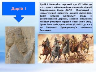 Дарій ІДарій І Великий— перський цар (521–486 до н.е.), один із найвизначніших правителів в історії Стародавнього Сходу. ДАРІЙ I (Дар'явауш) –наймогутніший правитель династії Ахеменідів. Дарій зміцнив центральну владу в реорганізованій державі, завдяки військовим походам розширив кордони Персії (нині Іран). Проте його похід проти скіфів (514–513 до н.е.) до Північного Причорномор'я закінчився безславно.