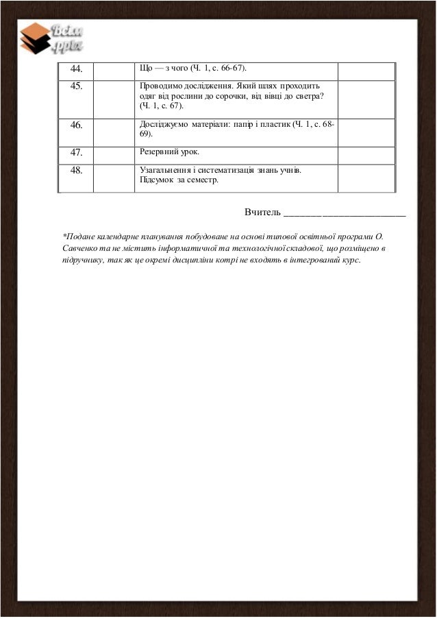 Календарне планування складено відповідно до діючих Програм Міністерства освіти і науки України, рекомендованих для загальноосвітніх шкіл.( І семестр) за Типовою освітньою програмою, розроблена під керівництвом Савченко О. Я.