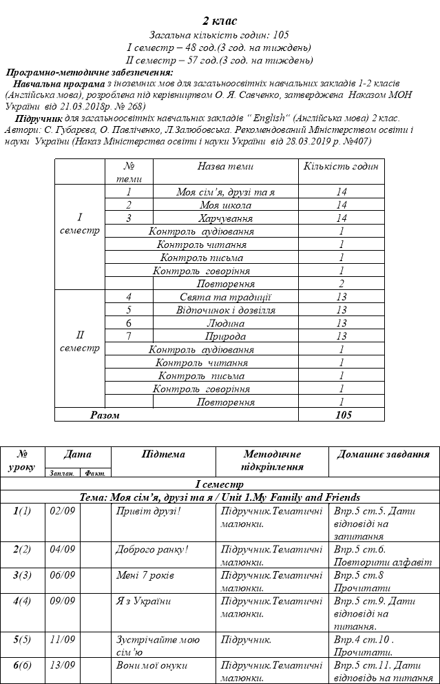 ДО підручника для загальноосвітніх навчальних закладів “English“ (Англійська мова) 2 клас. Автори: С. Губарєва, О. Павліченко, Л.Залюбовська.