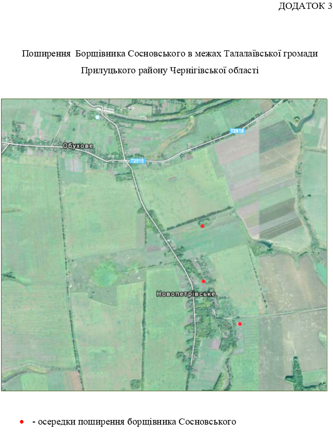 Також наша Талалаївська громада не включена до переліку територій Чернігівської області, на яких зустрічається Борщівник Сосновського, що не є карантинним, але дуже небезпечний та отруйний. Я особисто не раз спостерігала високі зарості цієї рослини на зволожених ділянках поблизу села Українське. Рясніють Борщівниками Сосновського болотисті місцевості сіл Новопетрівське, Скороходове та інших прилеглих занедбаних територій. До невтішних висновків привело обстеження місцевості селища Талалаївка. На жаль, борщівник Сосновського заполонив прибережні ділянки ставу поблизу стаціонарного сміттєзвалища, зустрічається поблизу об’єктів господарювання, поряд залізничного насипу. (Додатки 4, 5, 6 ) Це свідчить про те, що робота із знищення небезпечних бур’янів належним чином не ведеться. Осередки поширення борщівнику я також позначила на мапі Талалаївського району.