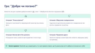 Гра: "Добре чи погано?"Визначте, яка дія є проявом доброзичливості (👍), а яка — кібербулінгом або його підтримкою (👎). Ситуація: “Класна фотка!”Залишити позитивний та підтримуючий коментар під чиїмось фото. Ситуація: Образливе повідомлення. Надсилання однокласнику приватного повідомлення, яке містить глузування чи критику. Ситуація: Виклав фото без дозволу. Розміщення чиєїсь особистої фотографії без її чіткої згоди. Ситуація: Підтримав друга. Захистити жертву в коментарях або особисто, звернувши увагу на проблему. Золоте правило: Пам’ятай, що у мережі діють ті ж самі правила поваги, що й у реальному житті. Доброта починається з тебе!