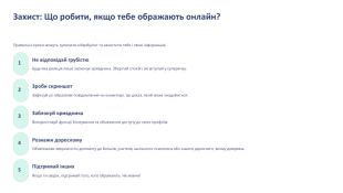 Захист: Що робити, якщо тебе ображають онлайн?Правильні кроки можуть зупинити кібербулінг та захистити тебе і твою інформацію.1 Не відповідай грубістю. Будь-яка реакція лише заохочує кривдника. Зберігай спокій і не вступай у суперечку.2 Зроби скриншот. Зафіксуй усі образливі повідомлення чи коментарі. Це доказ, який може знадобитися.3 Заблокуй кривдника. Використовуй функції блокування та обмеження доступу до своїх профілів.4 Розкажи дорослому. Обов'язково звернися по допомогу до батьків, учителя, шкільного психолога або іншого дорослого, якому довіряєш.5 Підтримай інших. Якщо ти свідок, підтримай того, кого ображають. Не мовчи!