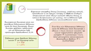 Візьмемо консервну банку (склянку, тарілку тощо), поставимо її на аркуш паперу й обведемо олівцем. Отримаємо коло. Якщо ниткою обвити банку, а потім випрямити цю нитку, то її довжина буде дорівнювати довжині намальованого кола. Виміряємо діаметр кола та знайдемо відношення довжини кола до його діаметра. Якщо виміри зроблені правильно, то це відношення буде приблизно дорівнювати 3,14. Для всіх кіл відношення довжини кола до довжини його діаметра є одним і тим самим числом. Це число позначають грецькою літерою ∏ (читається «пі»), його записують нескінченним десятковим дробом: ∏ = 3,14159265 Довжина кола дорівнює добутку числа ∏ на діаметр колаl = ∏d l = 2∏r