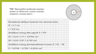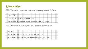 Вправиl = ∏dl = 3,14 • 3,2 = 10,048 см Відповідь: довжина кола дорівнює 10,048 см. S = ∏r²S = 3,14 • 8² = 3,14 • 64 = 200,96 см² Відповідь: площа круга дорівнює 200,96 см²