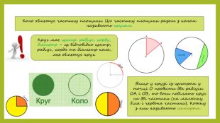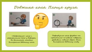 Довжина кола. Площа круга.«Надріжемо» коло і розпрямимо його у відрізок. За допомогою лінійки виміряємо довжину кола. Пофарбуємо коло фарбою та прокотимо по рівній поверхні, зробивши повний оберт. Далі виміряємо довжину сліду.