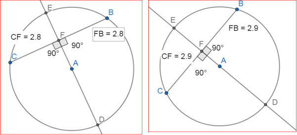 а). Учням пропонується накреслити коло довільного радіуса, провести в ньому будь-яку хорду і діаметр кола, що перпендикулярний до неї. Для цього слід використовувати геометричний інструмент «Перпендикулярна пряма», а для зображення хорди скористуватися інструментом «Точка на об’єкті» для того, щоб потім динамічно змінювати їх положення, залишаючи точками кола. Позначити точку перетину діаметра з хордою. Виміряти довжини відрізків, на які діаметр поділив хорду.