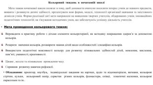 Кольоровий тиждень в початковій школі Мета тижня початкової школи полягає в тому, щоб допомогти вчителю посилити інтерес учнів до певного предмета, виявити і розвинути дитячі здібності, презентувати нові форми, моделі, технології організації навчання та змістовного дозвілля учнів. Форми реалізації цієї мети направлені на виявлення творчих учителів, обдарованих учнів; інноваційних педагогічних технологій; на з'ясування методичних умов, що забезпечують успішну діяльність учителів. Мета проведення кольорового тижня: Впровадити в практику роботи з дітьми елементи кольоротерапії, як методику покращення здоров’я за допомогою кольорів. Розкрити значення кольорів, розширити знання дітей щодо особливостей і специфіки кольорів. Використати педагогічні можливості кольору для розвитку пізнавальних здібностей дітей, мовлення, мислення, пам’яті, уважності, креативності. Цікаве , веселе та пізнавальне проведення часу. Сприяння розвитку навичок рефлексії. Обладнання: проектор, ноутбук, індивідуальні завдання на картках, аудіо та відеоматеріали, ватмани, кольорові стрічки, кульки, кольоровий папір, серветки різних кольорів, фломастери, олівці, тематичні малюнки, кольорові парасольки та ін..