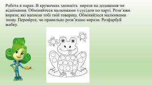 Робота в парах. В кружечках запишіть вирази на додавання чи віднімання. Обміняйтеся малюнками з сусідом по парті. Розв’яжи вирази, які написав тобі твій товариш. Обміняйтеся малюнками знову. Перевірте, чи правильно розв’язано вирази. Розфарбуй жабку.