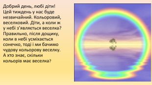 Добрий день, любі діти! Цей тиждень у нас буде незвичайний. Кольоровий, веселковий. Діти, а коли ж у небі з’являється веселка? Правильно, після дощику, коли в небі усміхається сонечко, тоді і ми бачимо чудову кольорову веселку. А хто знає, скільки кольорів має веселка?