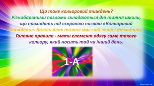 Що таке кольоровий тиждень?Різнобарвними пазлами складаються дні тижня школи, що проходять під яскравою назвою «Кольоровий тиждень». Кожен день тижня має свій колір і тематику. Головне правило - мати елемент одягу саме такого кольору, який носить той чи інший день.1-А