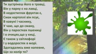 Ти зустрінеш його в травці,Він у парку є на лавці,В недостиглах фруктах є,Смак картоплі він псує,В кавуні і часнику,У чаю, що до смаку,Він у паростках пшениціІ в очицях,що у киці,Є також у світлофоріІ у водоростях в морі. Здогадались вже напевне,Що за колір то?