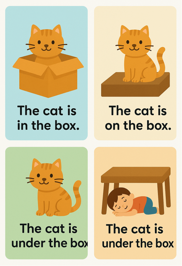 Приклади: The cat is on the table. The cat is under the table. The cat is in the box.