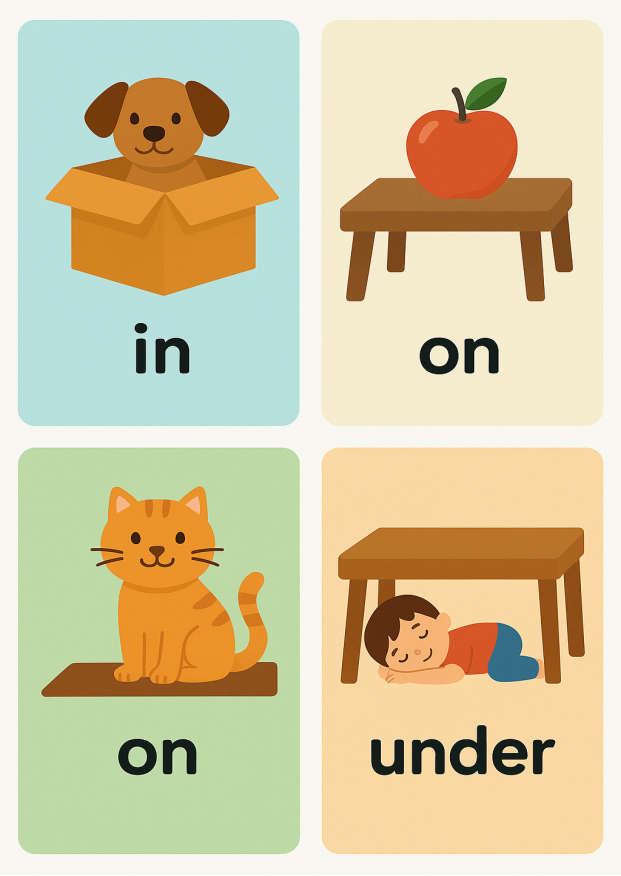 3. Презентація граматики "Prepositions" (6 хв): Вчитель демонструє прийменники за допомогою предметів або слайдів: ON , UNDER , IN.