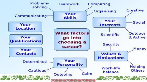 T: (Slide 12) Look at the Mind-Map “What factors go into choosing a career?” and add your own thought and ideas to it.
