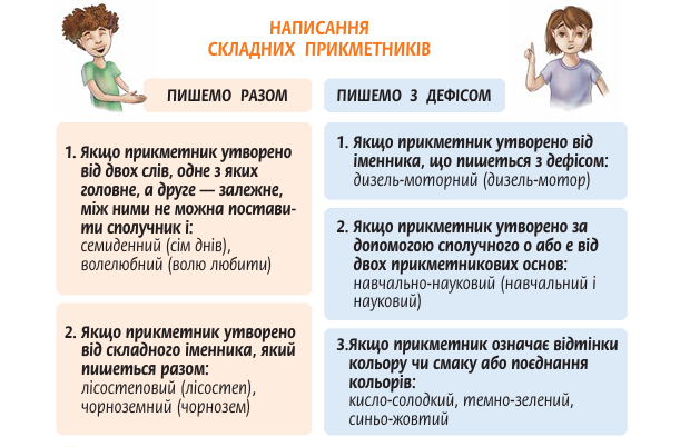 Тема уроку: Написання складних прикметників разом і з дефісом