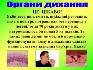 ЦЕ ЦІКАВО! Якби весь пил, сміття, шкідливі речовини, що є в повітрі, потрапляли без перешкод у легені, то за 70 років життя у них нагромадилось би понад 5 кг шлаків. За таких умов легені не могли б нормально функціонувати. Тому в дихальних шляхах наявна система захисних бар’єрів. Яких?