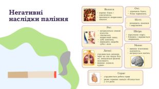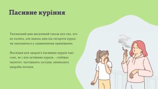 Пасивне куріння. Тютюновий дим шкідливий також для тих, хто не палить, але вдихає дим від сигарети курця чи знаходиться у задимленому приміщенні. Наслідки для здоров’я пасивних курців такі самі, як і для активних курців, - слабшає імунітет, частішають застуди, виникають хвороби легенів.