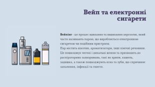 Вейп та електронні сигарети. Вейпінг - це процес вдихання та видихання аерозолю, який часто називають парою, що виробляється електронною сигаретою чи подібним пристроєм. Пар містить нікотин, ароматизатори, інші хімічні речовини. Це пошкоджує легені і дихальні шляхи та призводить до распіраторних захворювань, такі як хрипи, кашель, задишка, а також пошкоджують ясна та зуби, що спричиняє запалення, інфекції та гниття.