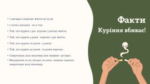 Факти. Куріння вбиває!1 цигарка скорочує життя на 15 хв;1 пачка цигарок - на 5 год;Той, хто курить 1 рік, втрачає 3 місяці життя;Той, хто курить 4 роки - втрачає 1 рік життя;Той, хто курить 20 років - 5 років;Той, хто курить 40 років - 10 років втрачає;Смертельна доза нікотину для людини - 50-75мг;Викурюючи 20-25 сигарет на день, людина отримує смертельну дозу нікотину.