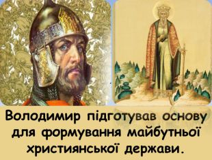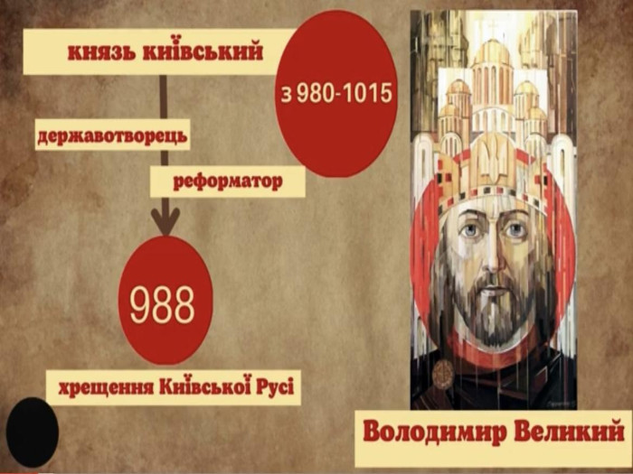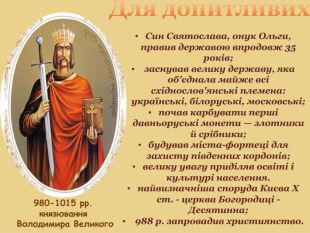 Син Святослава, онук Ольги, правив державою впродовж 35 років; заснував велику державу, яка об'єднала майже всі східнослов'янські племена: українські, білоруські, московські; почав карбувати перші давньоруські монети — злотники й срібники; будував міста-фортеці для захисту південних кордонів;велику увагу приділяв освіті і культурі населення.найвизначніша споруда Києва Х ст. - церква Богородиці - Десятинна; 988 р. запровадив християнство.980-1015 рр.князювання Володимира Великого. Для допитливих