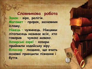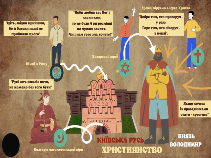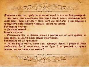 Чому далекою і чужою виявилася для Володимира магометанська віра? Чому не вдалося іноземцям з Рима переконати київського князя у перевазі своєї віри? Чим зумовлена відмова Володимира прийняти віру хозарських євреїв? Як вважаєте, грецький філософ зумів переконати чи тільки зацікавив Володимира у силі своєї віри?Бесіда за змістом