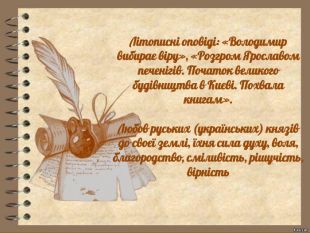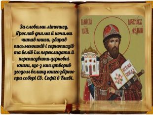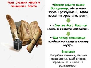Роль руських князів у поширенні освіти«Батько всього цього Володимир, він землю зорав і розпушив її, тобто просвітив християнством». «Син же його Ярослав засіяв книжними словами».«Ми тепер пожинаємо, приймаємо серцем книжну науку». Висновок. Потрібно вчитися, багато працювати, щоб справа предків не зникла, а розвивалася.