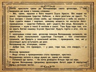 Потім прислали греки до Володимира свого філософа, і той звернувся до князя з такими словами:— Ми, греки, віруємо в Бога нашого Ісуса Христа. Він ходив по землі, проповідував Царство Небесне, а його розп’яли на хресті. Та Ісус воскрес і сказав учням своїм, що повернеться з неба на землю і буде судити живих і мертвих, кожному воздасть по заслугах його: праведникам — Царство Небесне, рай і радість без кінця, безсмертя, а грішникам — муки в пеклі й кипіння в смолі. Така буде кара тим, хто не вірить Богові нашому Ісусові Христові: будуть горіти в огні, хто не хреститься.І, закінчивши слово своє, філософ показав Володимиру запинало, на якому було намальовано судилище Господнє і тих стовплених грішників, які бредуть у пекельний вогонь, і праведників, тих, які у веселощах духу вступають до раю. Володимир же, зітхнувши, сказав:— Добре тим, хто праворуч, — у раю, горе тим, хто ліворуч, — у пеклі. Філософ промовив:— Якщо хочеш з праведниками стати праворуч, хрестись. Володимиру запала в серце думка ця, однак він сказав:— Почекаю ще трохи, — бо хотів розвідати більше про всі віри.І вручив Володимир грецькому філософові багаті дари й відпустив його з великою честю.