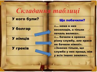 Складання таблиці{A783 BA23-A30 A-47 A8-B6 A1-F03 AC92 D2656}У кого були?У болгар. У німців. У греків{A783 BA23-A30 A-47 A8-B6 A1-F03 AC92 D2656}«… нема в них веселощів, а тільки печаль велика».«… бачили в храмах різну службу, але краси не бачили ніякої».«Знаємо тільки, що служба у них краща, ніж у всіх інших землях». Що побачили?