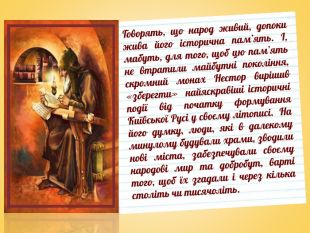 Говорять, що народ живий, допоки жива його історична пам’ять. І, мабуть, для того, щоб цю пам’ять не втратили майбутні покоління, скромний монах Нестор вирішив «зберегти» найяскравіші історичні події від початку формування Київської Русі у своєму літописі. На його думку, люди, які в далекому минулому будували храми, зводили нові міста, забезпечували своєму народові мир та добробут, варті того, щоб їх згадали і через кілька століть чи тисячоліть.