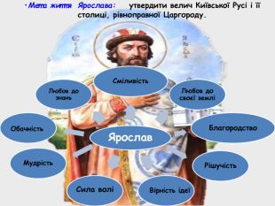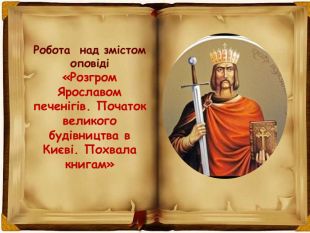 Сходженню Ярослава на престол передувала подія, яка описується у «Повісті минулих літ». Про що саме йдеться? Літопис зображує події 1034 р., коли печеніги напали на Київ за відсутності Ярослава, який зібрав військо в Новгороді та пішов визволяти свою столицю. Рішуча битва виникла на рівнині, на якій зараз стоїть собор Святої Софії. Печеніги були розгромлені.