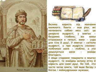 Велика користь від навчання книжного. Книги - мов ріки, які напоюють собою весь світ; це джерело мудрості, у книгах - бездонна глибина; ми ними втішаємося в печалі, вони - узда для тіла й душі. У книгах - світило мудрості, а про мудрість сказано: люблячих мене - люблю, а хто дошукується мене - знайде благодать.І якщо старанно пошукати в книгах мудрості, то знайдеш велику втіху й користь для своєї душі. Бо той, хто часто читає книги, той веде бесіду з Богом і наймудрішими мужами.