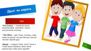 Друзі чи вороги Герої 3 Том Сойєр — головний герой, винахідливий, сміливий і часом неслухняний хлопець. Гек Фінн— друг Тома, хлопець, який живе на вулиці і не має батьків, але він чесний і вірний друг. Джуді — подруга Тома, хоча її роль в історії менш виразна, вона також демонструє певні риси дружби.