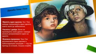 Дружба Тома і Гека. Вірність один одному: Гек і Том завжди підтримують одне одного, навіть коли це небезпечно. Чесність і довіра: Вони не приховують своїх думок і завжди можуть розраховувати один на одного. Взаємна підтримка: Том і Гек допомагають один одному в найскладніших ситуаціях — під час пригод на острові, пошуку скарбів.
