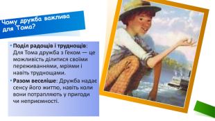 Чому дружба важлива для Тома?Поділ радощів і труднощів: Для Тома дружба з Геком — це можливість ділитися своїми переживаннями, мріями і навіть труднощами. Разом веселіше: Дружба надає сенсу його життю, навіть коли вони потрапляють у пригоди чи неприємності.