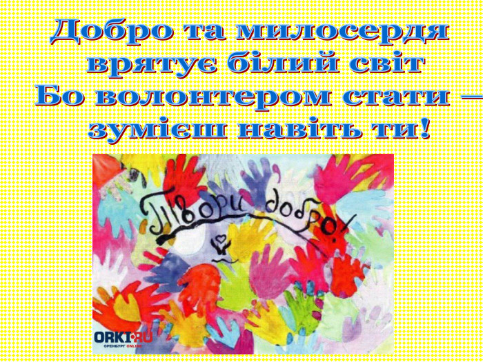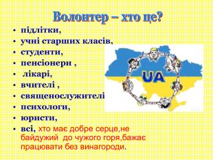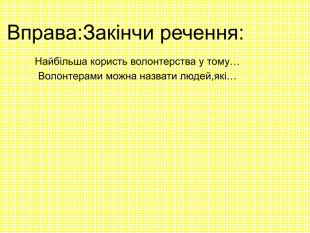 Вправа:Закінчи речення: Найбільша користь волонтерства у тому… Волонтерами можна назвати людей,які…