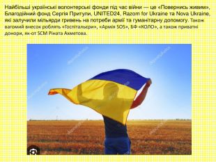 Найбільші українські волонтерські фонди під час війни — це «Повернись живим», Благодійний фонд Сергія Притули, UNITED24, Razom for Ukraine та Nova Ukraine, які залучили мільярди гривень на потреби армії та гуманітарну допомогу. Також вагомий внесок роблять «Госпітальєри», «Армія SOS», БФ «КОЛО», а також приватні донори, як-от SCM Ріната Ахметова.