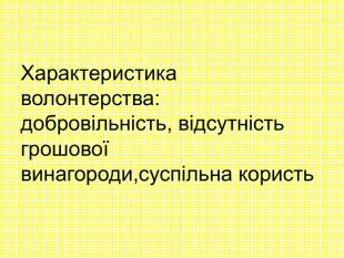 Характеристика волонтерства: добровільність, відсутність грошової винагороди,суспільна користь