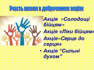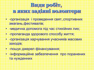 -організація і проведення свят.,спортивних змагань,фестивалів; -медична допомога під час стихійних лих; -пропаганда здорового способу життя; -організація харчування учасників масових заходів; -пошук джерел фінансування; -інформаційне забезпечення про поранених та нужденних