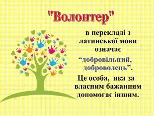 в перекладі з латинської мови означає “добровільний, доброволець”. Це особа, яка за власним бажанням допомогає іншим.