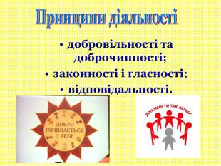 добровільності та доброчинності; законності і гласності; відповідальності.
