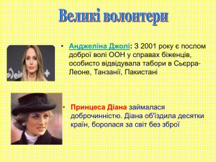 Анджеліна Джолі: З 2001 року є послом доброї волі ООН у справах біженців, особисто відвідувала табори в Сьєрра-Леоне, Танзанії, Пакистані Принцеса Діана займалася доброчинністю. Діана об'їздила десятки країн, боролася за світ без зброї