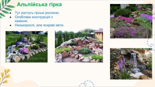 Альпійська гірка. Тут ростуть гірські рослини. Особлива конструкція з каміння. Низькорослі, але яскраві квіти.