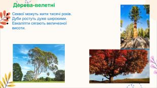 Дерева-велетніСеквої можуть жити тисячі років. Дуби ростуть дуже широкими. Евкаліпти сягають величезної висоти.