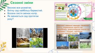 Сезонні зміни. Весною все розквітає. Влітку сад найбільш барвистий. Восени листя змінює колір. Як змінюється сад протягом року?
