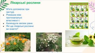 Лікарські рослини. М'ята допомагає при застуді. Ромашка має протизапальні властивост.іКалендула загоює рани. Які ще лікарські рослини ви знаєте?