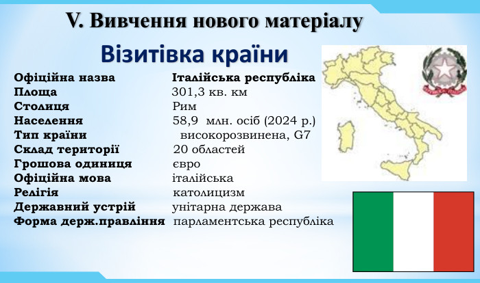 Візитівка країни Офіційна назва Італійська республіка Площа 301,3 кв. км Столиця Рим Населення 58,9 млн. осіб (2024 р.) Тип країни високорозвинена, G7 Склад території 20 областей Грошова одиниця євро Офіційна мова італійська Релігія католицизм Державний устрій унітарна держава Форма держ.правління парламентська республіка V. Вивчення нового матеріалу