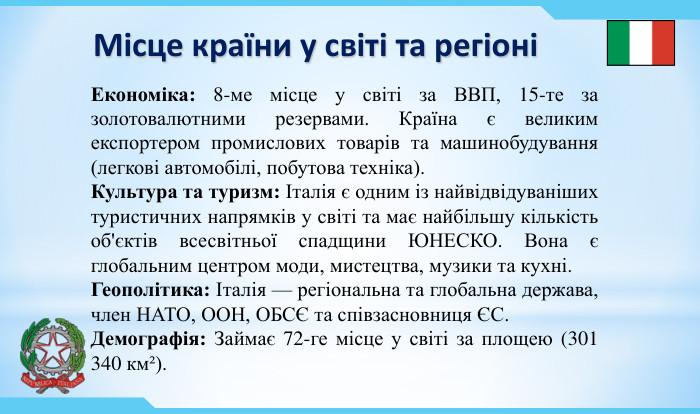 Місце країни у світі та регіоні Економіка: 8-ме місце у світі за ВВП, 15-те за золотовалютними резервами. Країна є великим експортером промислових товарів та машинобудування (легкові автомобілі, побутова техніка). Культура та туризм: Італія є одним із найвідвідуваніших туристичних напрямків у світі та має найбільшу кількість об'єктів всесвітньої спадщини ЮНЕСКО. Вона є глобальним центром моди, мистецтва, музики та кухні. Геополітика: Італія — регіональна та глобальна держава, член НАТО, ООН, ОБСЄ та співзасновниця ЄС. Демографія: Займає 72-ге місце у світі за площею (301 340 кмІ).