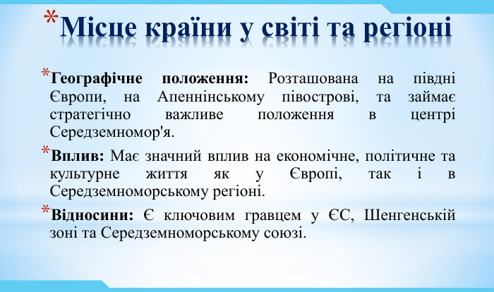 Географічне положення: Розташована на півдні Європи, на Апеннінському півострові, та займає стратегічно важливе положення в центрі Середземномор'я. Вплив: Має значний вплив на економічне, політичне та культурне життя як у Європі, так і в Середземноморському регіоні. Відносини: Є ключовим гравцем у ЄС, Шенгенській зоні та Середземноморському союзі.